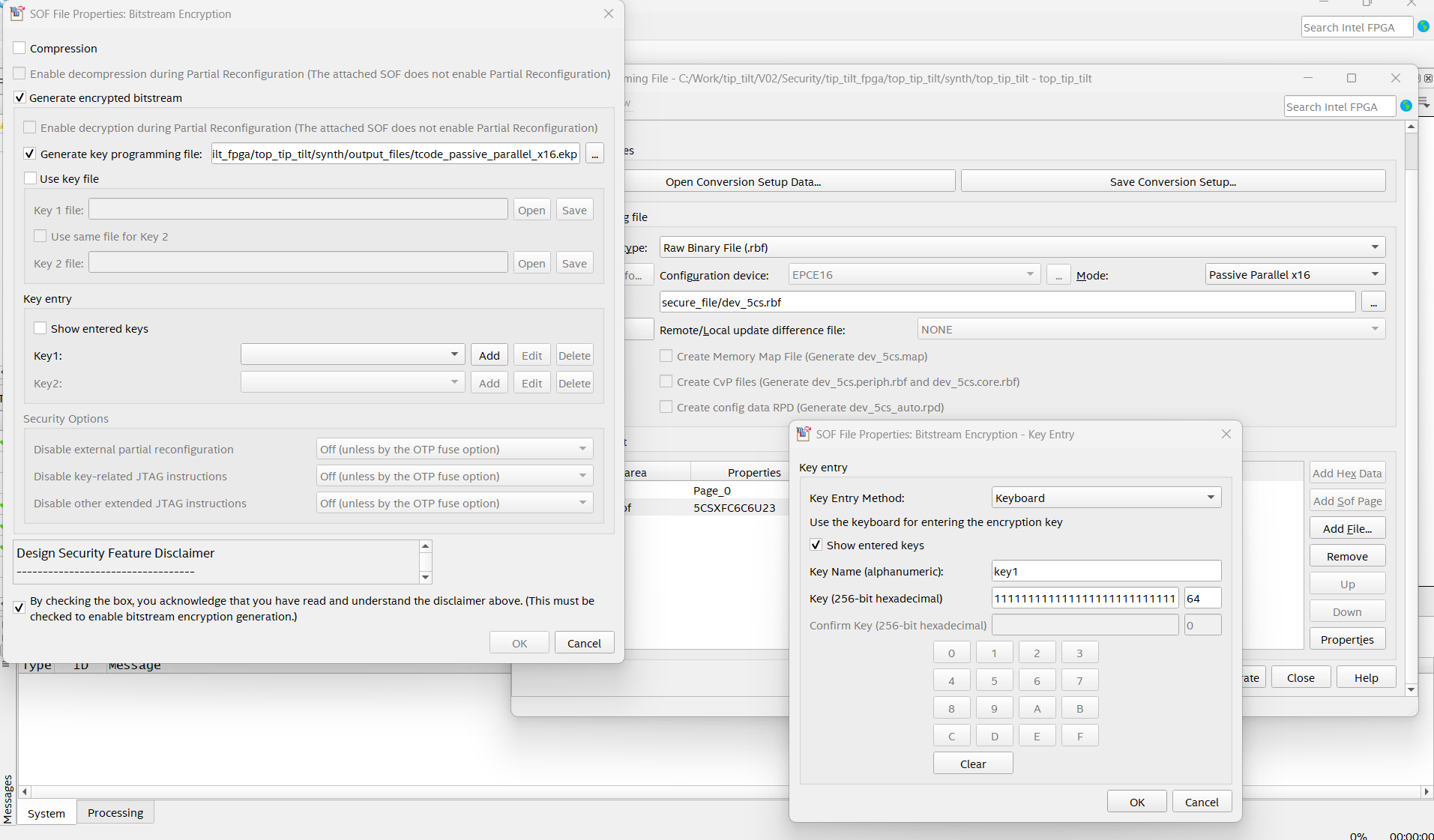 In Quartus, I enabled bitstream encryption and generated an encrypted RBF file (dev_5cs.rbf) as well as the corresponding .ekp key file (screenshots attached).