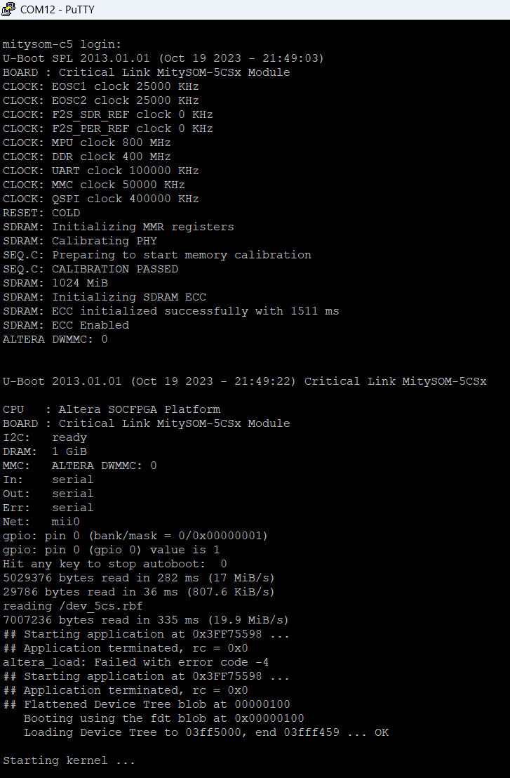 When I boot the system and monitor the console in PuTTY, the boot process stops at “Starting kernel …” and does not proceed further. If I replace the encrypted bitstream with an unencrypted .rbf file, the system boots correctly.